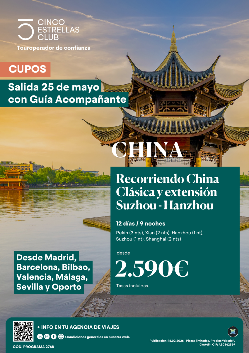 Cupos|China clásica y ext.Suzhou-Hanzhou 12d/9n dsd 2.590€sal.25.05 guia acomp.sal.mad,Bcn,Bio,Vlc,Agp,Svq,opo